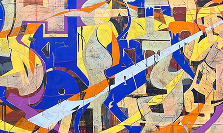Peter Galasso’s imaginative paintings are featured in a solo exhibition that highlights the artist’s bold abstractions. His layering of visual elements demonstrates a mastery of composition. Color, shapes and shifting spaces create complex images that reflect his search for structure and meaning. Galasso has traditional training, and much of his past work focused on representational still life and figurative subjects. The evolution of his work drew him toward abstraction.